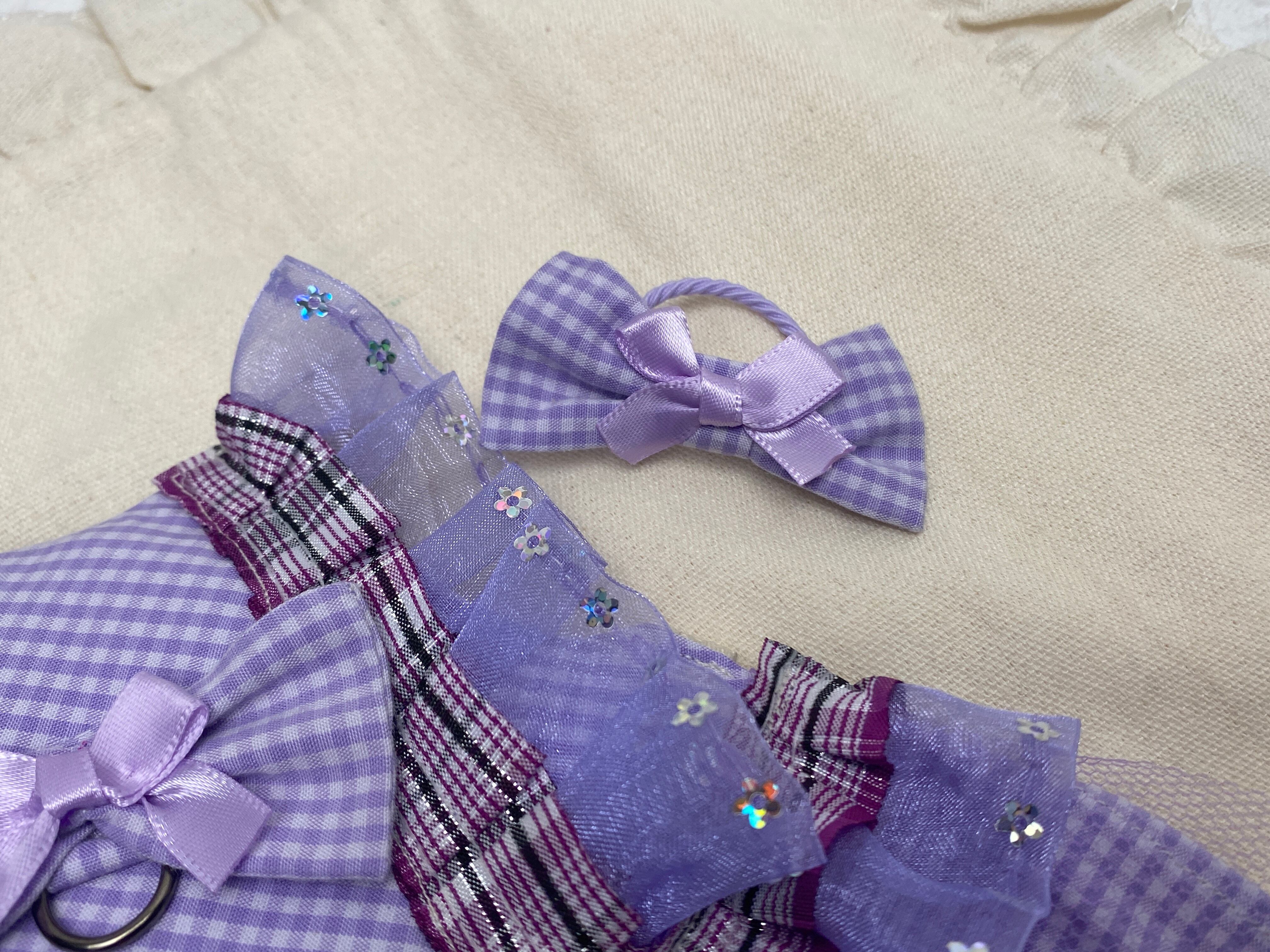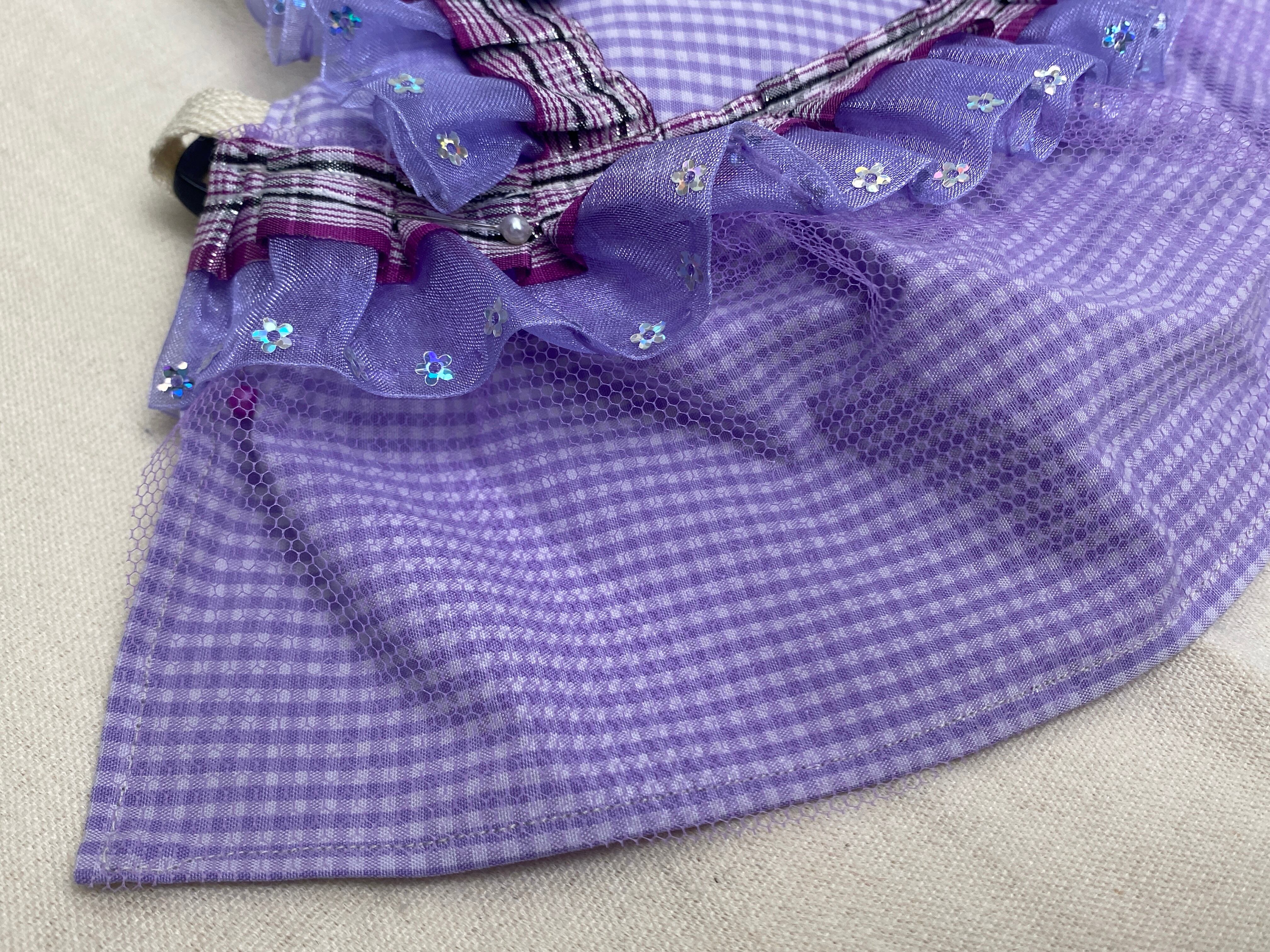 パステルパープルにギンガムチェック、フリル付きリボンとチュール。